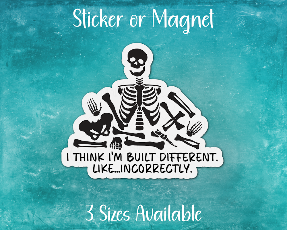 Funny Skeleton Sticker or Magnet | I Think I'm Built Different. Like... Incorrectly